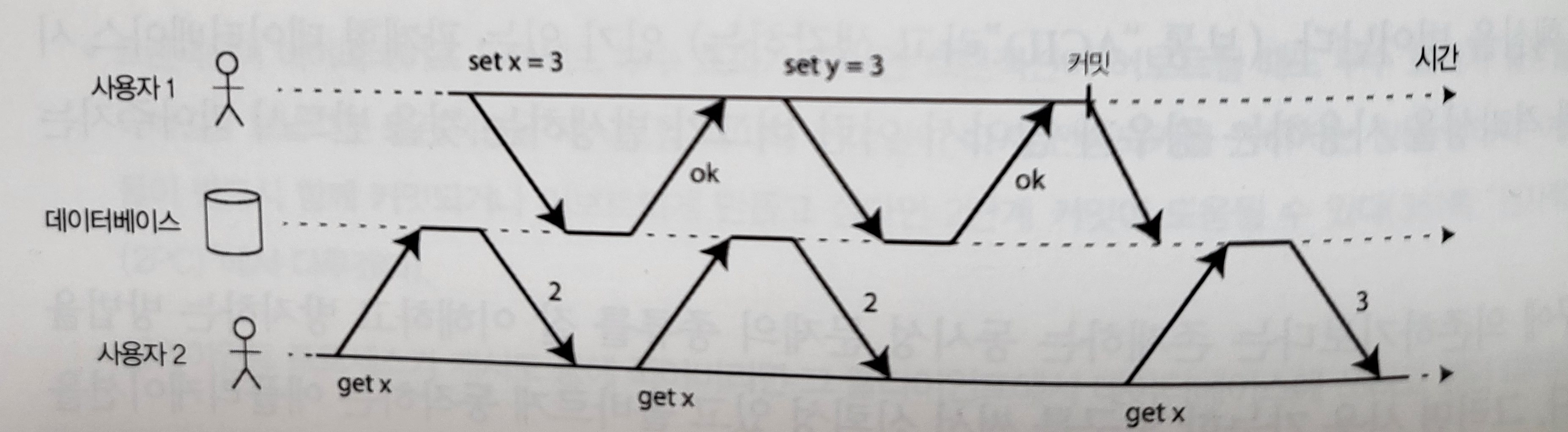 - 갱신 손실 : 두 트랜잭션이 작업을 동시에 하면 두번째 쓰기 작업이 첫 번째 변경을 포함하지 않으므로 변경 중 하나는 손실될 수 있음