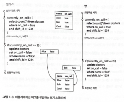 - 데이터베이스에서 스냅숏 격리를 사용하므로 둘 다 2를 반환해서 두 트랜잭션 모두 다음 단계로 진행함