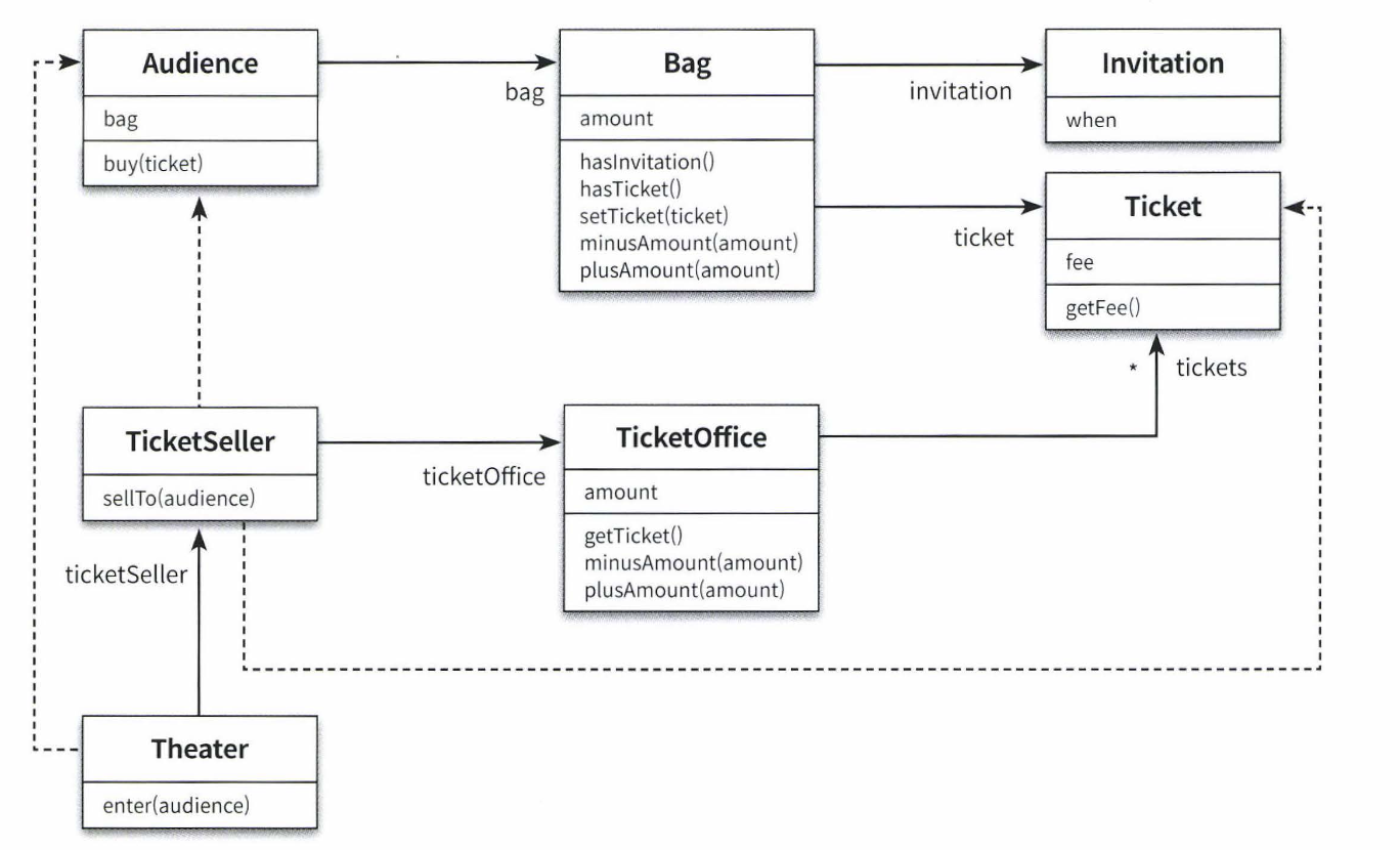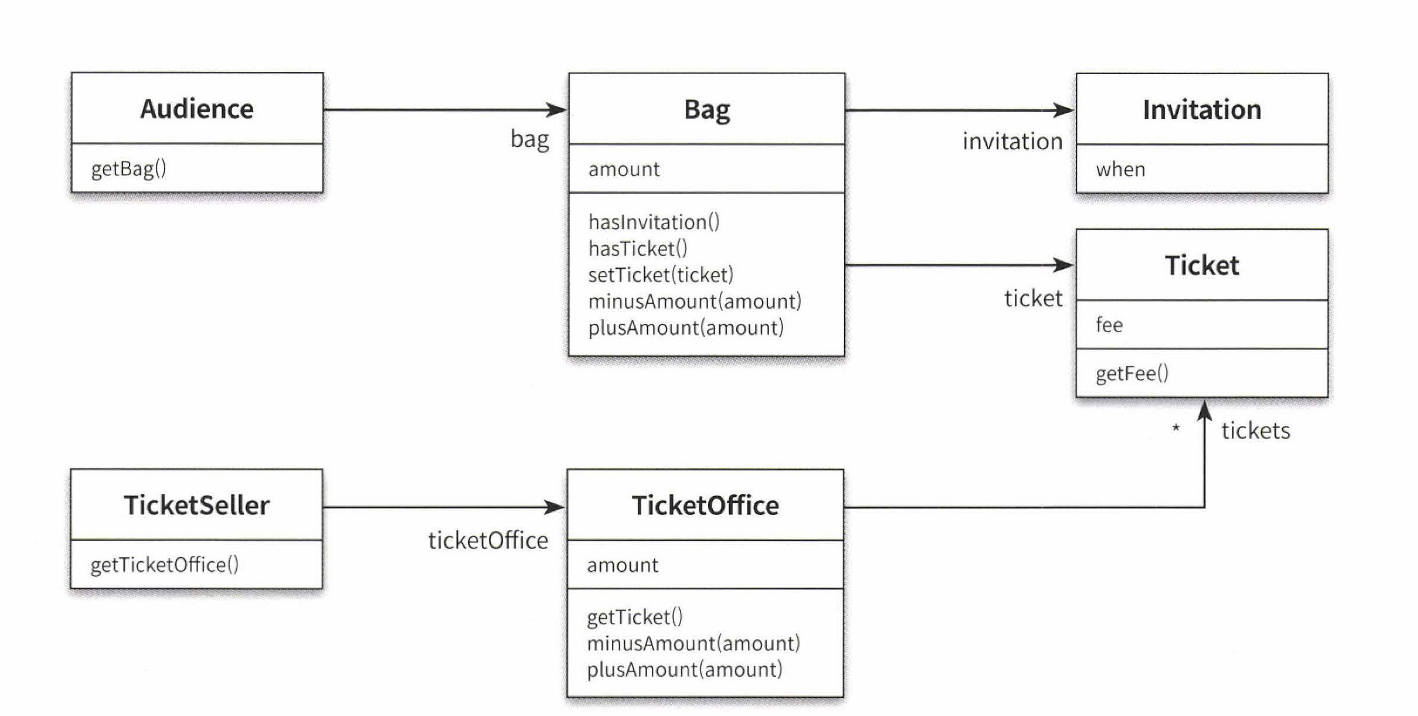 - Theater의 enter 메서드를 이해하기 위해서는 Audience가 Bag을 가지고 있고, Bag 안에는 현금과 티켓이 들어 있으며 TicketSeller가 TicketOffice에서 티켓을 판매하고, TicketOffice는...등등