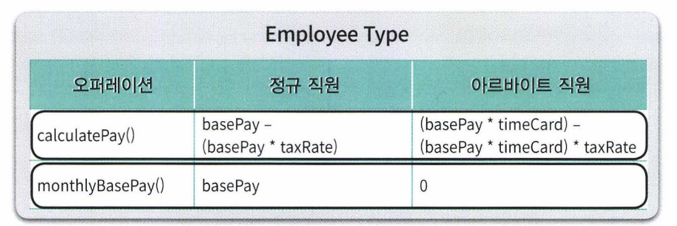 - 정규 직원과 아르바이트 직원이라는 두 개의 타입을 명시적으로 정의하고 두 직원 유형과 관련된 오퍼레이션의 실행 절차를 두 타입에 분배한다.