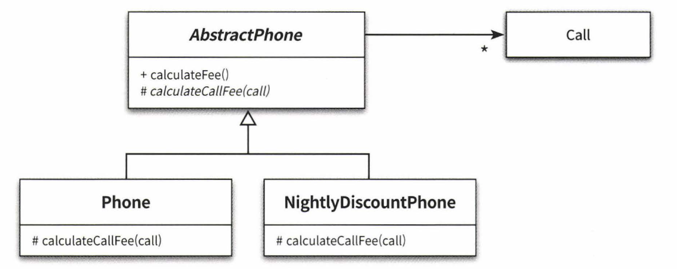 - 일반 요금제와 심야 할인 요금제의 calculateFee의 for문 안에 구현된 요금 계산 로직이 서로 다르다는 사실을 알 수 있다.