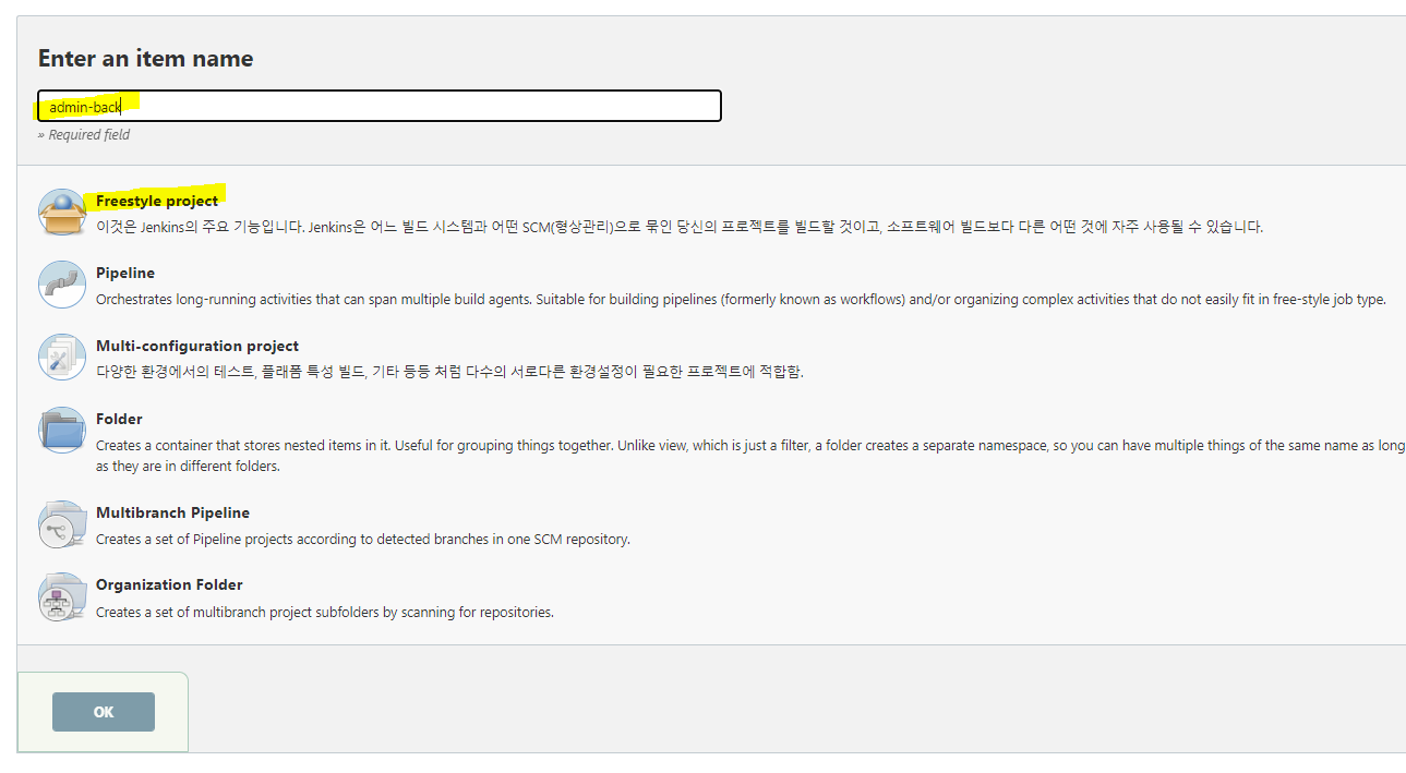 item의 이름을 정해주고, Freestyle project 클릭 후 OK