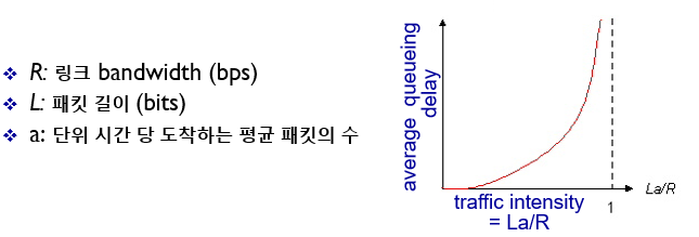 - 트래픽 강도(traffic intensity) : L * a / R = 단위시간 당 유입되는 트래픽의 양을 링크의 bandwidth(R)로 나눈 것!