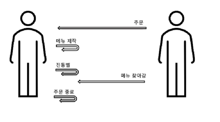 요청자가 카페에 들어가서 주문을 하면, 사장님(처리자)이 주문을 받고 메뉴를 만드는 동안 요청자는 사장님이 음료를 언제 다 만드는지 계속 보고 있다가, 음료가 완성되어 받아서 나가면 사장님은 이 한건의 주문이 완료가 된다.