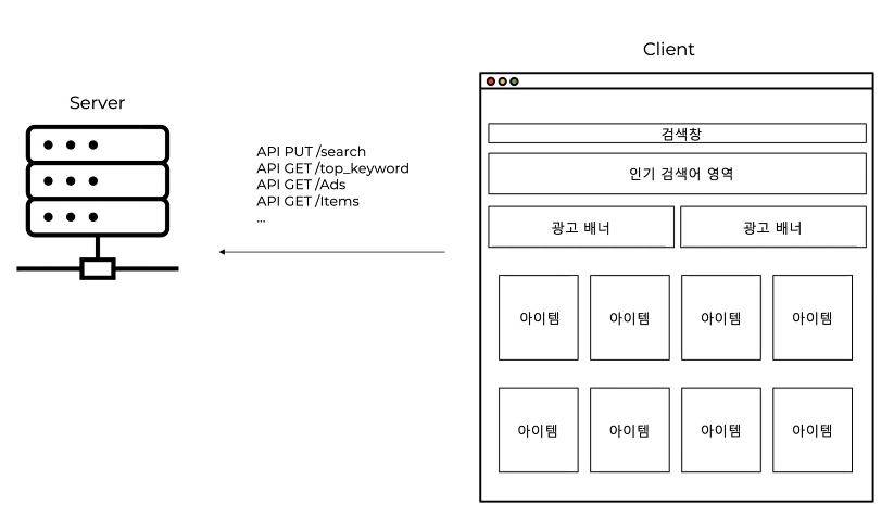클라이언트(요청자)는 검색창, 인기검색어, 광고, 아이템들에 대한 API 요청을 서버(처리자)에 보낸다.