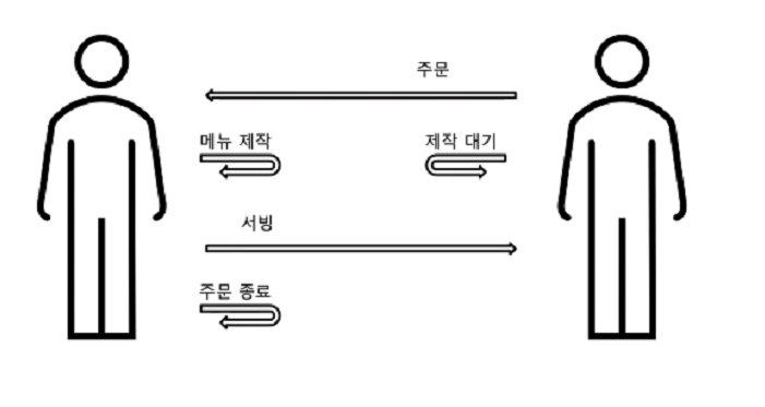 요청자가 카페에 들어가서 주문을 하면, 사장님(처리자)이 주문을 받고 메뉴를 만드는 동안 요청자는 사장님이 음료를 언제 다 만드는지 계속 보고 있다가, 음료가 완성되어 받아서 나가면 사장님은 이 한건의 주문이 완료가 된다.