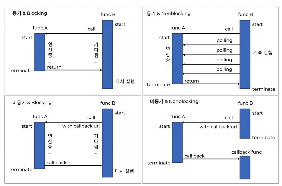 func B가 func A를 call 하면, func B는 func A의 작업이 완료되어 return 될때까지 본인 할일을 하면서 func A의 작업이 완료 되었는지 주기적으로 계속 확인을 하다가, func A가 리턴되면 그 이후 func A를 신경쓰지 않음.