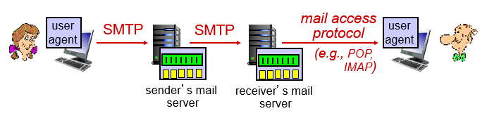 발송 유저 에이전트 -> 발송 서버 -> 수신서버 까지는 mail이 push 되어야하기 때문에 SMTP protocol이 사용되고, 수신 유저 에이전트는 수신 서버에서 메일을 pull 해야하기때문에 SMTP가 아닌 mail access protocol이 사용된다.