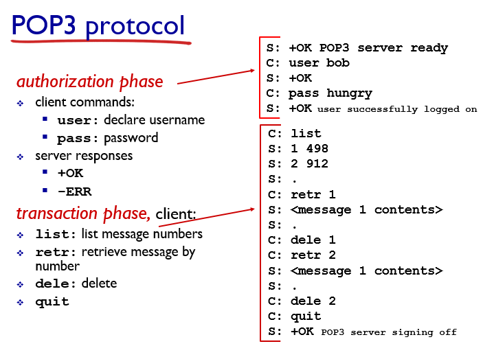 - authorization phase : client commands(user, pass), server responses(+OK, -ERR)로 구성