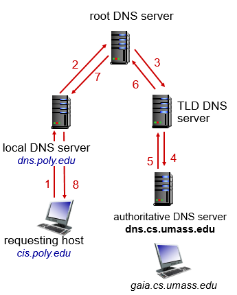 - 웹캐시처럼, 일차적인 URL 요청이 오면 Local DNS name server가 전부 받아서 해당 URL의 IP를 갖고 있으면 response를 해주고, 없으면 root DNS server로 넘긴다.