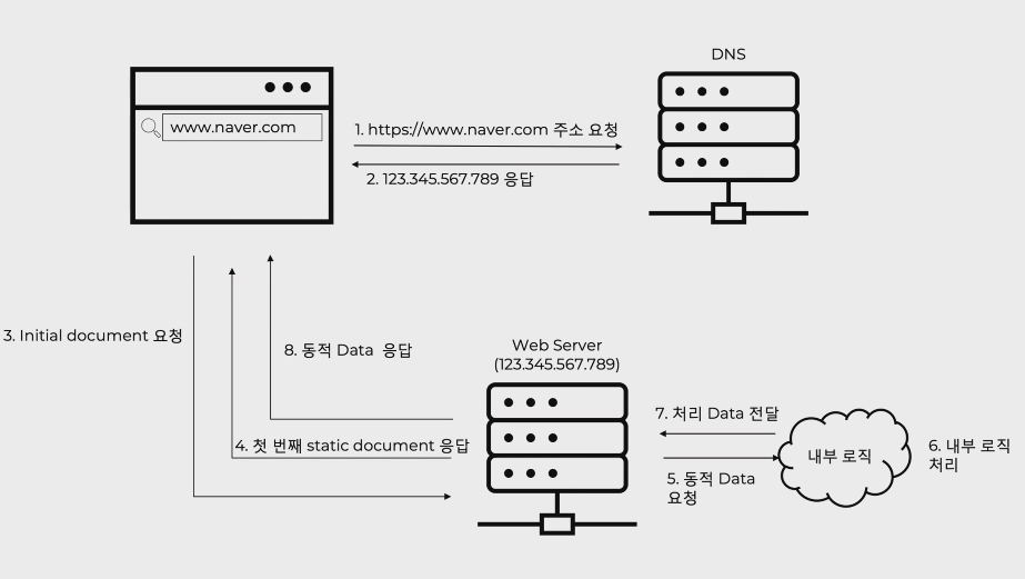 Q. 브라우저의 주소창에 www.naver.com을 입력 후 네이버 메인 화면이 브라우저에 로딩되기까지 일어나는 일련의 과정은 어떻게 되는가?