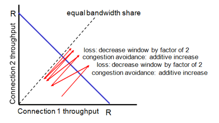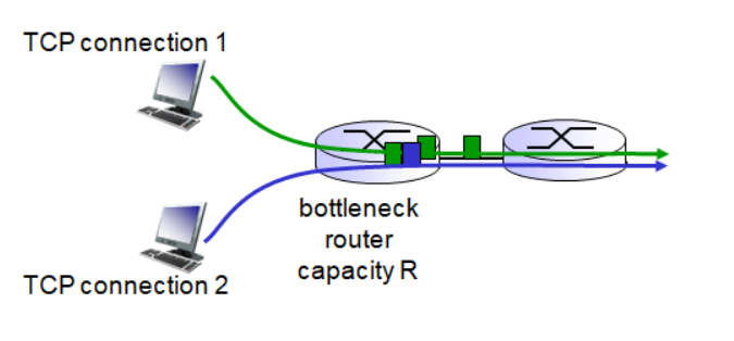 K개의 TCP 세션이 같은 R의 bandwidth를 가진 bottleneck link를 상용한다면, 각 세션은 평균 R/K를 가져야 한다.