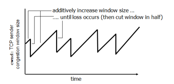 - tcp는 cwnd를 계속 늘려보다가, data loss가 생기면 cwnd를 확 줄였다가 야금야금 다시 늘려보면서 congestion control을 진행한다.