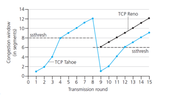 - TCP Reno : cwnd는 현재 cwnd의 반인 6으로 조정됨.