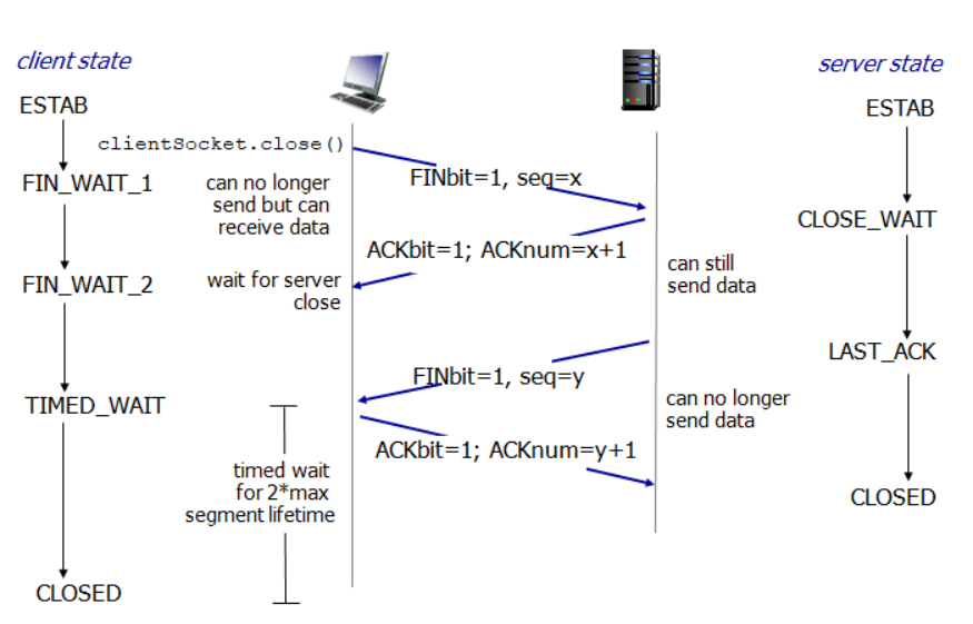 7. 클라이언트가 보낸 ACK을 서버가 받지 못할경우, FIN을 재전송 할 것을 고려해 클라이언트는 FIN을 받은 이후로 max segment lifetime * 2 만큼 기다린 뒤 소켓을 CLOSED 상태로 변경