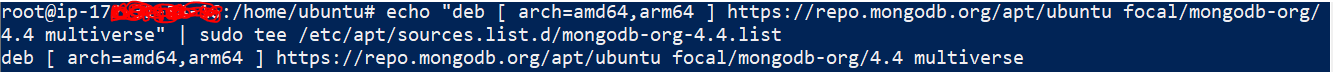 echo "deb [ arch=amd64,arm64 ] https://repo.mongodb.org/apt/ubuntu focal/mongodb-org/4.4 multiverse" | sudo tee /etc/apt/sources.list.d/mongodb-org-4.4.list
