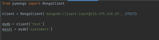 'client = MongoClient('mongodb://[USER_NAME]:[PASSWORD]@'+[HOST], [PORT])'