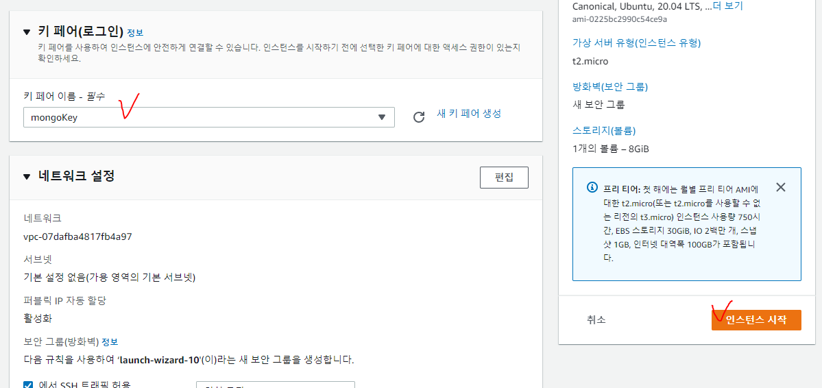 위에서 만든 키페어 선택 후 인스턴스 시작을 눌러 EC2 생성을 완료해줍니다.