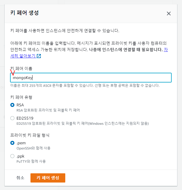 키페어의 이름을 적고 pem으로 키페어 생성 후 잘 저장해 둡니다.