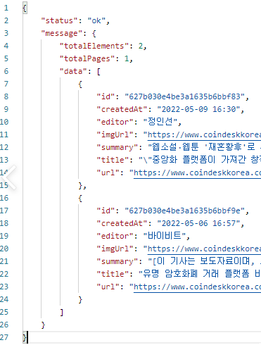 제목, 작성일, 작성자, summary, 썸네일uri, 뉴스기사 본문 uri를 가져와서