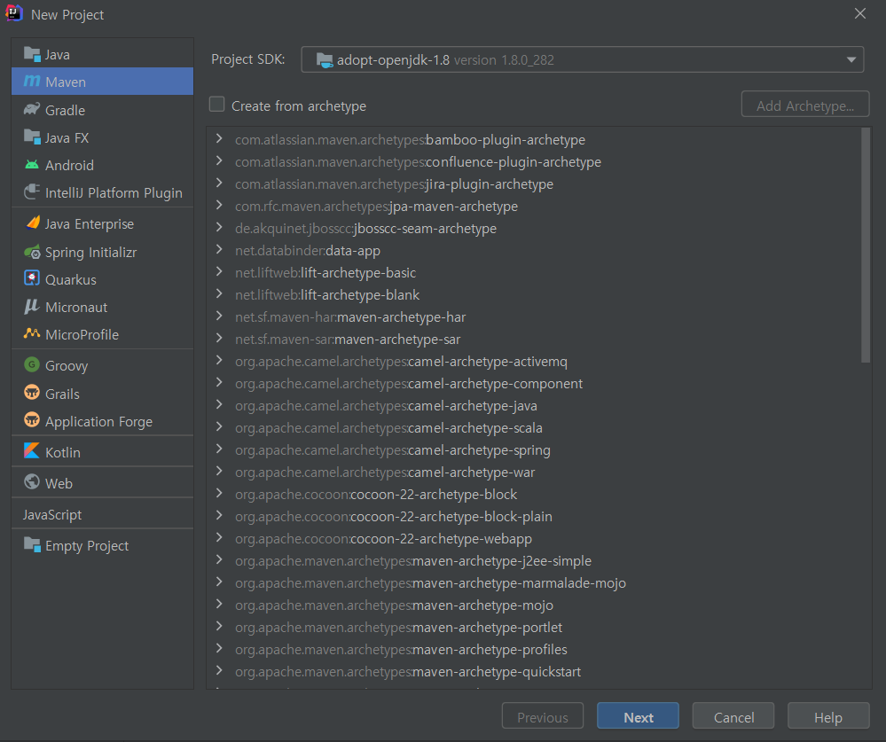New Project 목록에서 Maven을 클릭하고 Project SDK에서 JDK 버전을 선택해 줍니다.