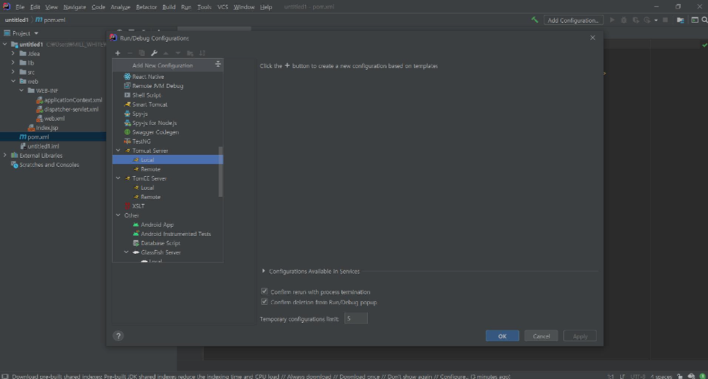 Run/Debug Configurations 창에서 좌측 상단 +를 클릭한 뒤 Tomcat Server->Local를 클릭해주세요.