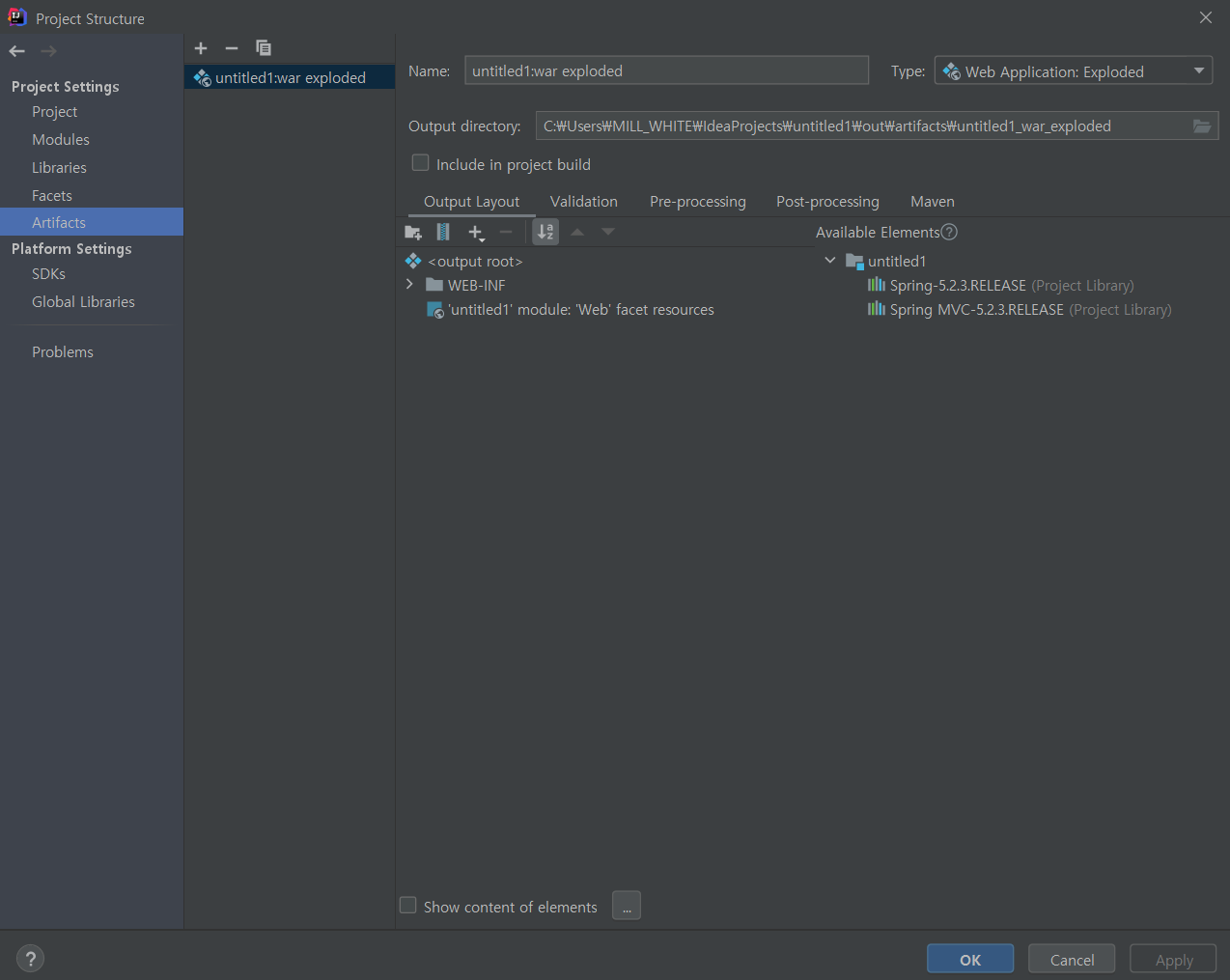 목록에서 Artifacts를 클릭 후 Output Layout->Available Elements의 라이브러리 두개를 더블클릭해주세요.