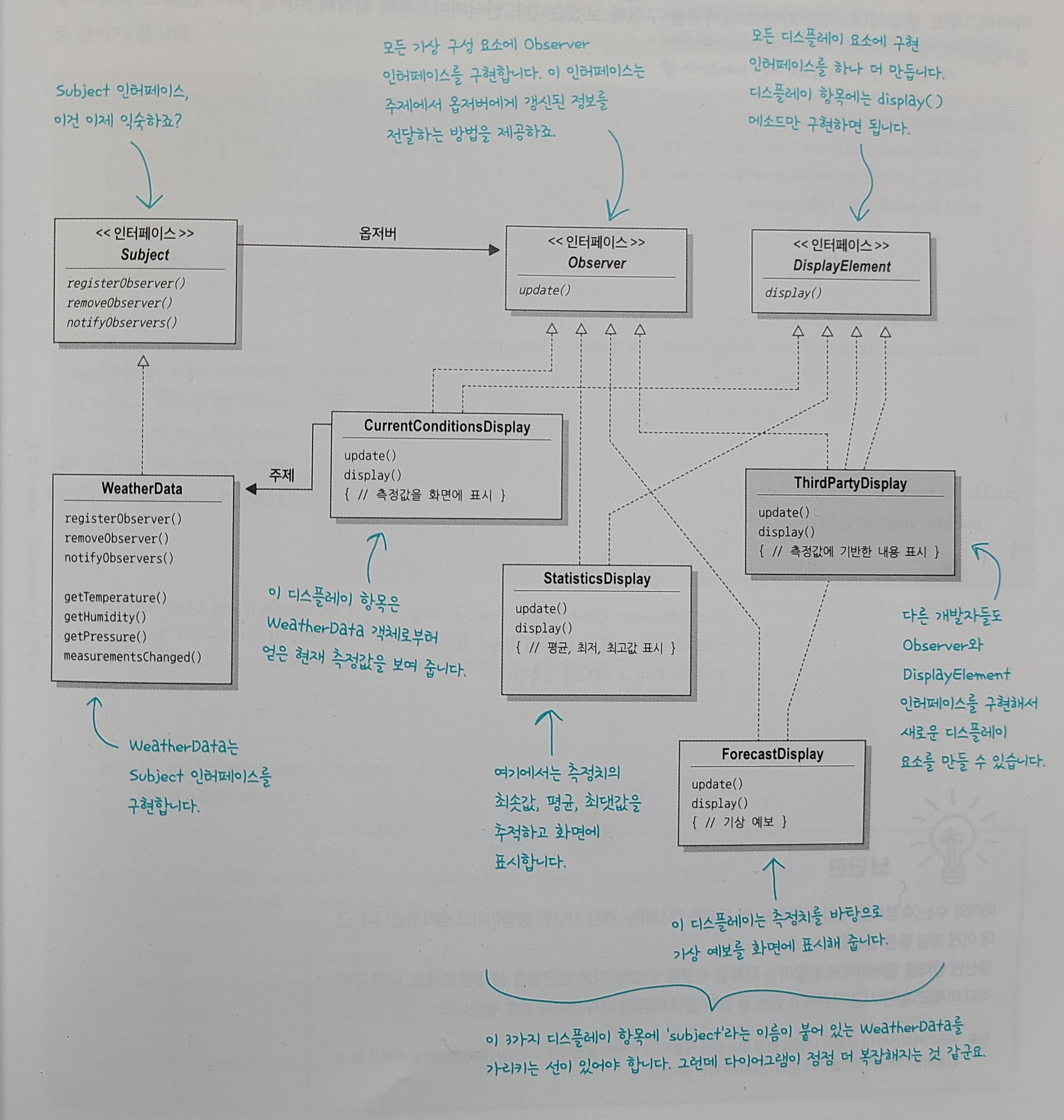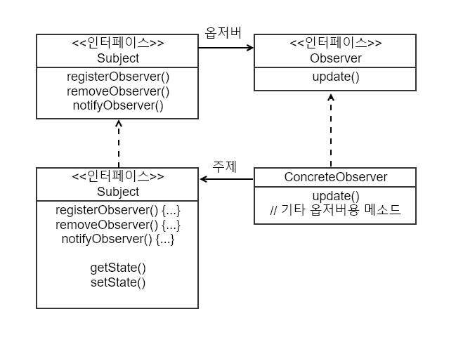 옵저버 패턴은 여러 가지 방법으로 구현할 수 있지만, 보통은 주제 인터페이스와 옵저버 인터페이스가 들어있는 클래스 디자인으로 구현한다.