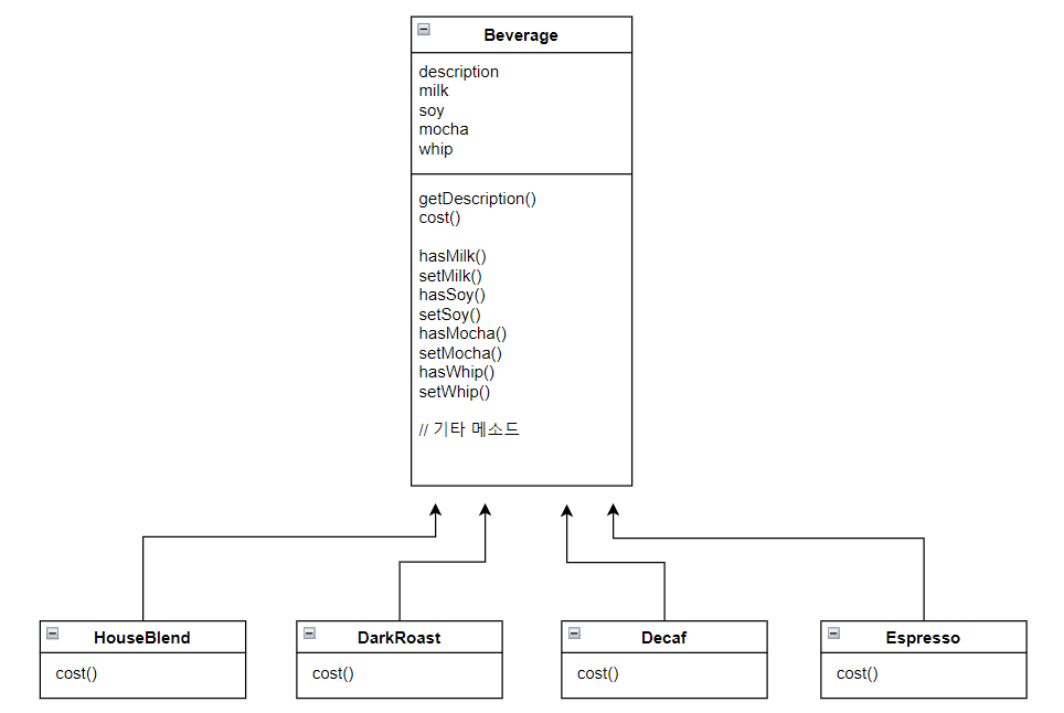 - 첨가물 종류가 많아지면 새로운 메소드를 추가해야 하고, cost() 메소드를 수정해야 한다.