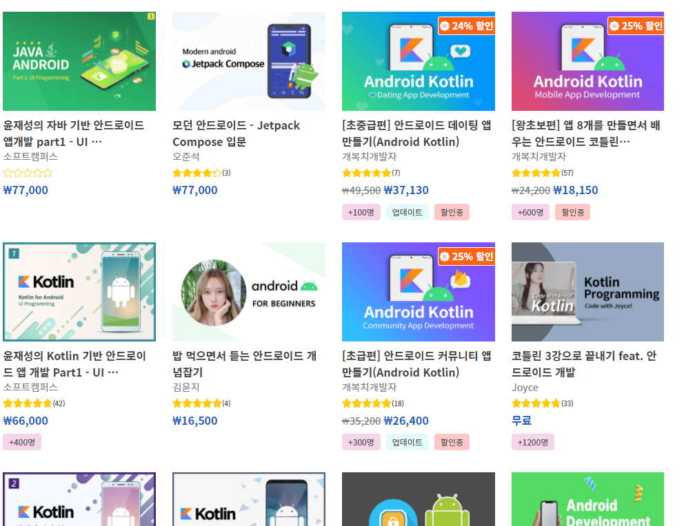 인프런에서 안드로이드 코틀린 강의를 이것저것 찾아보았다.