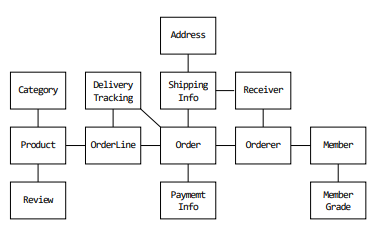 - 온라인 쇼핑몰 시스템을 개발할 때 아래와 같이 상위 수준 개념을 이용해서 전체 모델을 정리하면 전반적인 관계를 이해하는 데 도움이 된다.