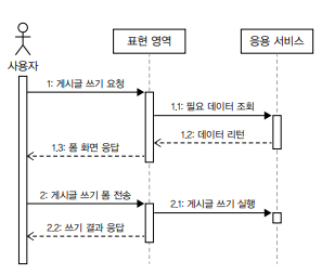 응용 영역에 위치한 서비스는 실제 사용자가 원하는 기능을 제공한다. 응용 서비스의 메서드가 요구하는 파라미터와 표현 영역이 사용자로부터 전달받은 데이터는 형식이 일치하지 않기 때무에 표현 영역은 응용 서비스가 요구하는 형식으로 사용자 요청을 변환한다. 응용 서비스를 실행한 뒤 표현 영역은 실행 결과를 사용자에게 맞는 형식으로 응답한다.