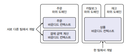 규모가 작은 기업은 전체 시스템을 한 개의 팀에서 구현할 때도 있다. 여러 하위 도메인을 하나의 바운디드 컨텍스트에서 개발할 때 주의할 점은 하위 도메인의 모델이 섞이지 않도록 하는 것이다. 하위 도메인마다 구분되는 패키지를 갖도록 구현해야 하며, 이렇게 함으로써 하위 도메인을 위한 모델이 서로 뒤섞이지 않고 하위 도메인마다 바운디드 컨텍스트를 갖는 효과를 낼 수 있다.