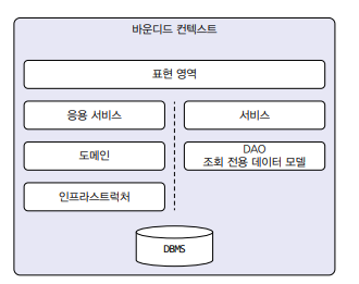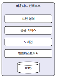 바운디드 컨텍스트는 도메인 모델 뿐만 아니라 도메인 기능을 사용자에게 제공하는 데 필요한 표현 영역, 응용 서비스, 인프라스트럭처 영역을 모두 포함한다. 도메인 모델의 데이터 구조가 바뀌면 DB 테이블 스키마도 함께 변경해야 하므로 테이블도 바운디드 컨텍스트에 포함된다.
