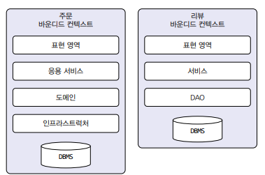 모든 바운디드 컨텍스트를 반드시 도메인 주도로 개발할 필요는 없다. 상품의 리뷰는 복잡한 도메인 로직을 갖지 않기 때문에 CRUD 방식으로 구현해도 된다. 즉 DAO와 데이터 중심의 밸류 객체를 이용해서 리뷰 기능을 구현해도 기능을 유지 보수하는데 큰 문제가 없다.