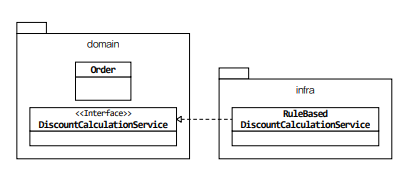 도메인 서비스의 구현이 특정 구현 기술에 의존하거나 외부 시스템의 API를 실행한다면 도메인 영역의 도메인 서비스는 인터페이스로 추상화 하고 실제 구현은 인프라스트럭처 영역에 위치할 수 있다. 이를 통해 도메인 영역이 특정 구현에 종속되는 것을 방지할 수 있고 도메인 영역에 대한 테스트가 쉬워진다.