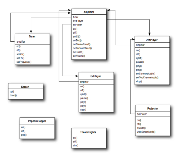 new HomeTheaterFacade(amp, tuner, dvd, cd, projector, screen, lights, popper);