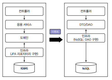 명령 모델과 조회 모델이 서로 다른 데이터 저장소를 사용할 수도 있다. 명령 모델은 트랜잭션을 지원하는 RDBMS를 사용하고, 조회 모델은 조회 성능이 좋은 메모리 기반 NoSQL을 사용할 수 있다.