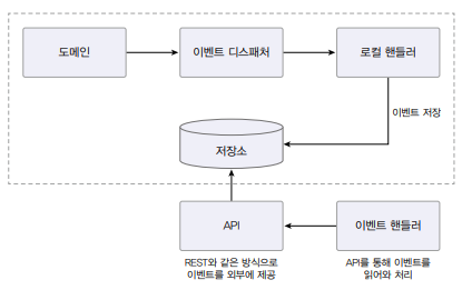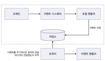 이벤트가 발생하면 핸들러는 스토리지에 이벤트를 저장한다. 포워더는 주기적으로 이벤트 저장소에서 이벤트를 가져와 이벤트 핸들러를 실행한다. 포워더는 별도 스레드를 이용하기 때무에 이벤트 발행과 처리가 비동기로 처리된다. 이 방식은 도메인 상태와 이벤트 저장소로 동일한 DB를 사용한다. 즉, 도메인 상태 변화와 이벤트 저장이 로컬 트랜잭션으로 처리된다. 이벤트를 물리적 저장소에 보관하기 때문에 핸들러가 이벤트 처리에 실패할 경우 포워더는 다시 이벤트 저장소에서 이벤트를 읽어와 핸들러를 실행하면 된다.