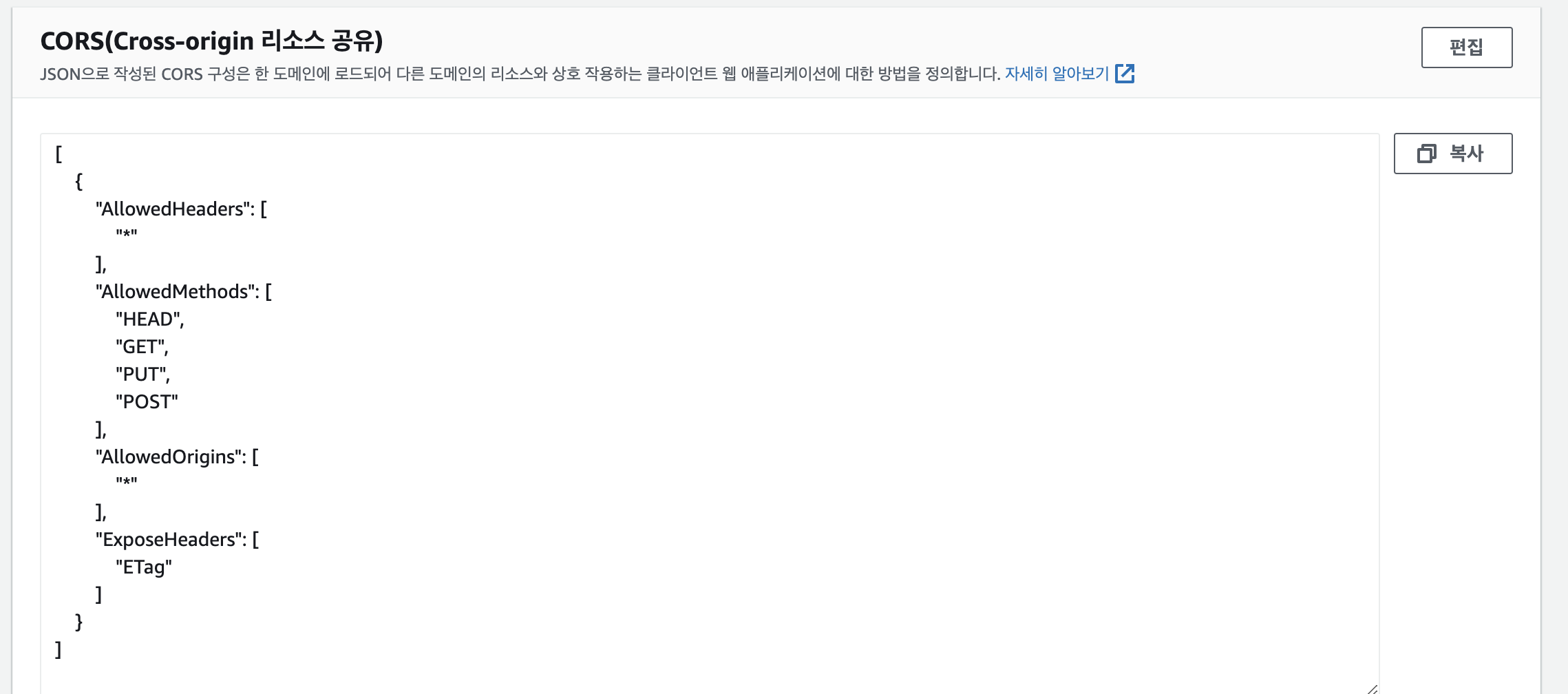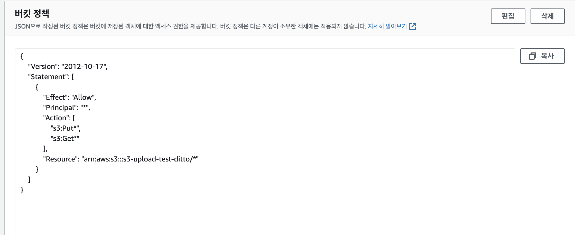 버킷 정책에 위의 코드를 적어준다. 해당 코드를 적지 않으면 이후에 403 (Forbidden)를 만나게 된다.