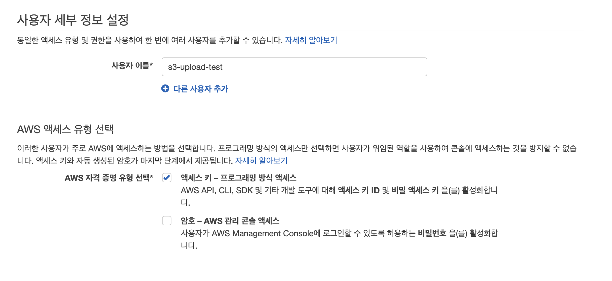 사용자 이름 작성 후 액세스 키 - 프로그래밍 방식 액세스 클릭 후 다음