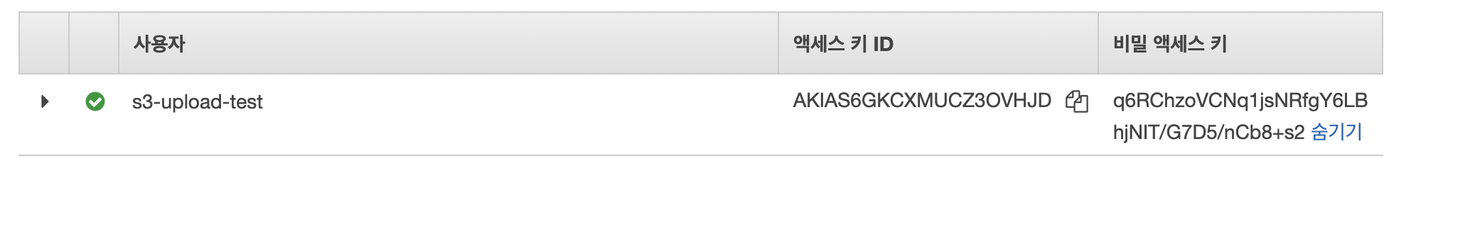 사용자가 만들어지면 액세스 키 ID와 비밀 액세스 키를 저장해 둔다.(실제 키는 외부에 노출되어서는 안됨)