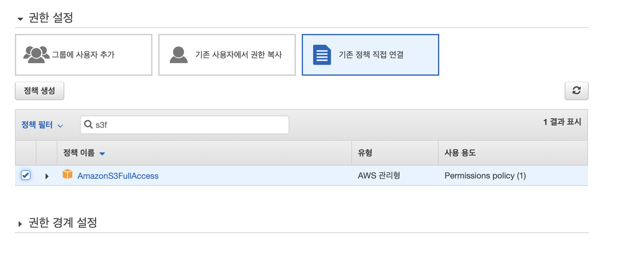 기존 정책 직접 연결에서 AmazonS3FullAccess 를 연결해준 뒤 사용자를 만들어 준다.