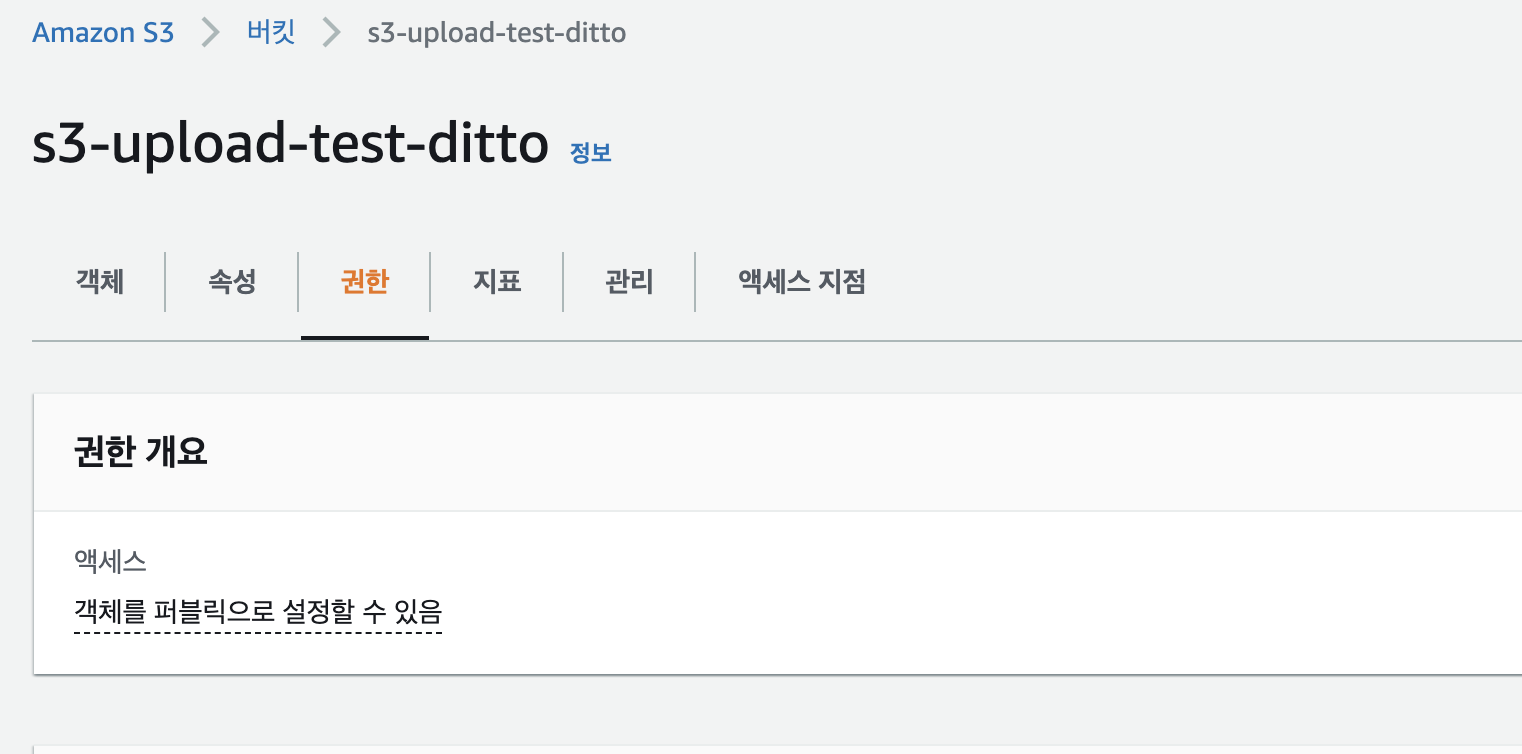 생성된 s3 버킷을 클릭하고 권한을 눌러서 두가지 설정을 해준다.