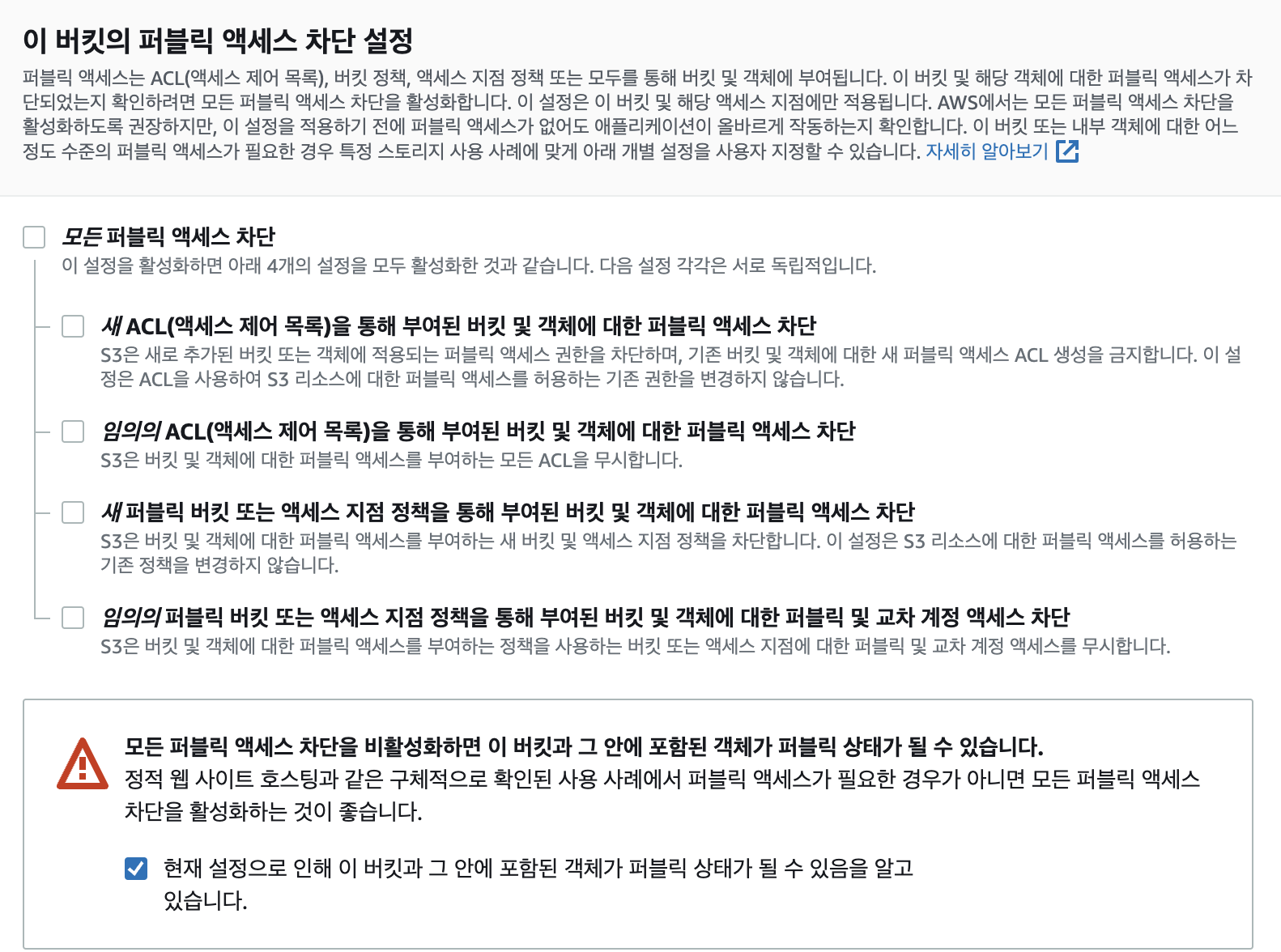 프론트에서 aws s3 버킷에 직접 접근으로 이미지를 받아올 예정이기 때문에, 퍼블릭 액세스를 열어준 후 생성한다.
